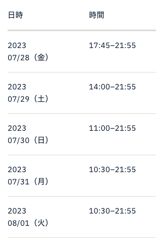 2023-07-28 8月1日までの特別営業時間を設定致しました。 お知らせ・つぶやき 予約システムを8月からの営業時間に変更しましたが8月1日(火)まではご予約を承れる時間帯に余裕がありますので特別営業日として予約可能に致しました。 2023/07/28(金) 17:45 - 21:552023/07/29(土) 14:00 - 21:552023/07/30(日) 11:00 - 21:552023/07/31(月) 10:30 - 21:552023/08/01(火) 10:30 - 21:55